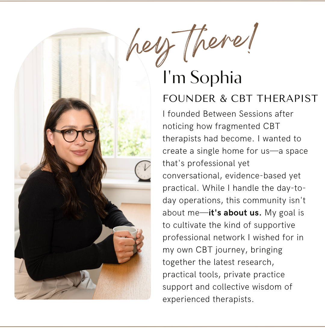 Between Sessions — I want to create space for the kind of honest, evidence-based conversations that make us better therapists. Whether you're just starting your CBT journey or have years of experience, there's a place for you here.