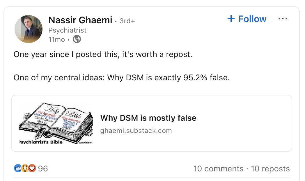 I think there is nuance to Ghaemi’s argument, as he’s also very critical of the anti psychiatry movement who contest that no psychiatric diagnosis is valid. He would argue that some are - I think around a dozen or so - like schizophrenia, bipolar disorder, panic disorder, OCD, and PTSD (which he likens to a psychological injury).