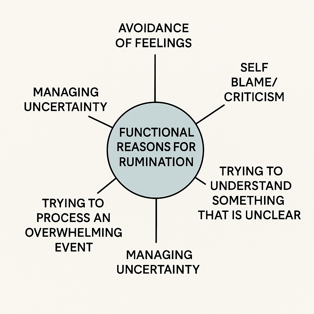 In simple terms, rumination keeps people “stuck”, continually revisiting distressing experiences or regrets. Unlike worry, which tends to focus on future events and uncertainty, rumination is rooted in the past, sustaining cycles of low mood and self-criticism.