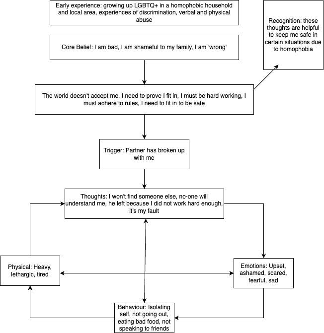 At the heart of CBT is a collaborative formulation with the client which focuses on the clients thoughts, emotions and behaviours, that trap them in a vicious cycle of distress.